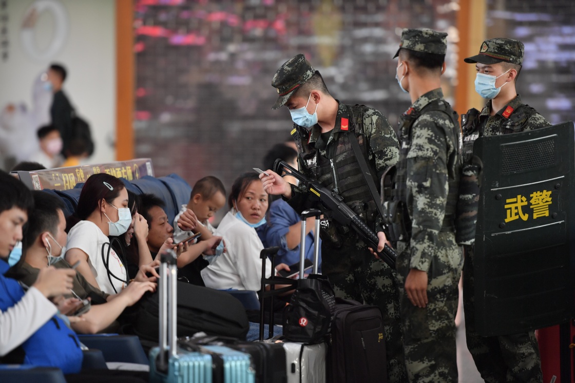 10月1日,武警福建總隊福州支隊執(zhí)勤官兵在福州火車站候車大廳查驗旅客證件。新華社發(fā)(李濤 攝)