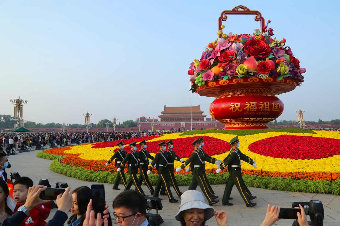10月1日,武警北京總隊執(zhí)勤第一支隊官兵行進在天安門廣場“祝福祖國”大花籃前。新華社發(fā)(李超 攝)