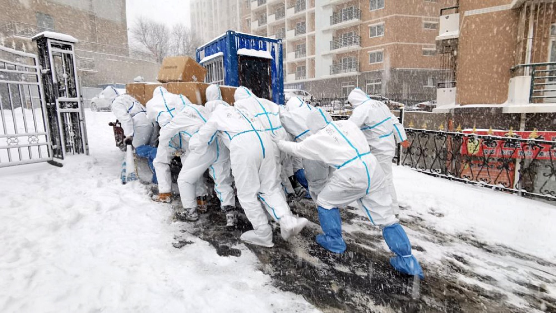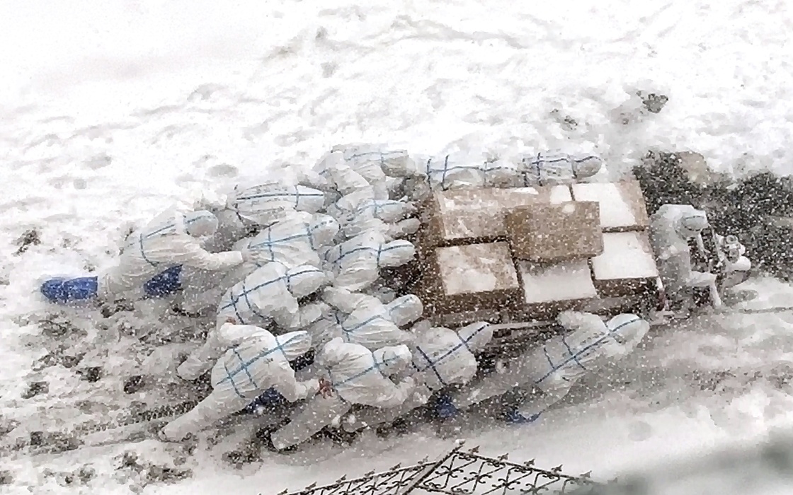 風(fēng)雪中,10余名志愿者推著一車(chē)防疫物資艱難前行,身上的防護(hù)服與白雪融為一色,飄揚(yáng)如絮的雪花不斷覆蓋著他們身后的腳印,可隊(duì)伍卻如雕塑般緩緩向前移動(dòng)?!耙欢?!”志愿者互相鼓勁的口號(hào)聲似在耳畔。