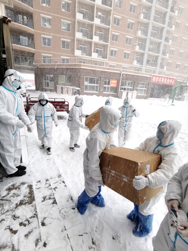 大連海洋大學(xué)的志愿者們將物資搬運(yùn)到學(xué)生宿舍。新華社發(fā)(大連海洋大學(xué)供圖)