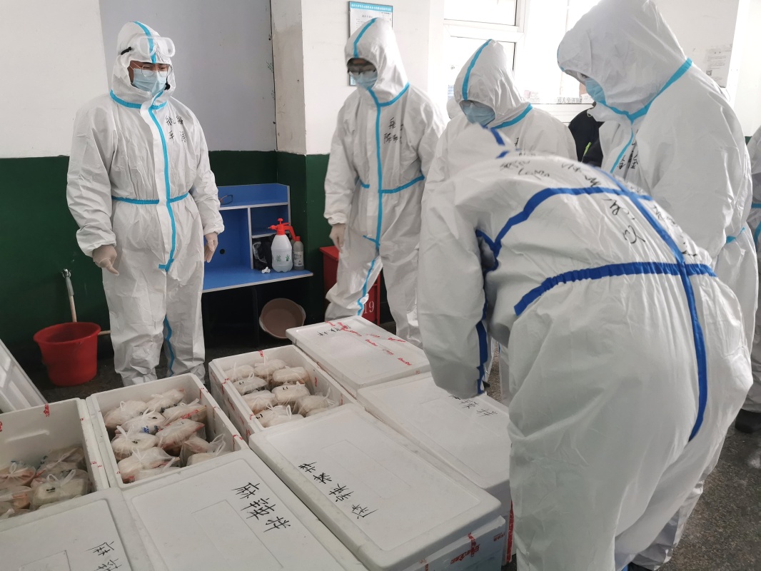 大連海洋大學(xué)“青年抗疫突擊隊(duì)”隊(duì)員給學(xué)生配送餐食。新華社發(fā)(大連海洋大學(xué)供圖)