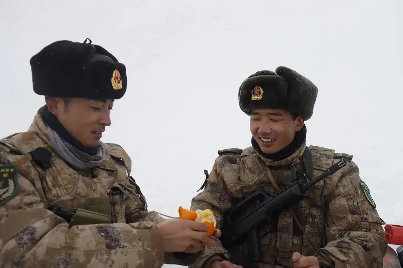 戰(zhàn)士分享“肖媽媽”寄來的橙子。松飛 攝