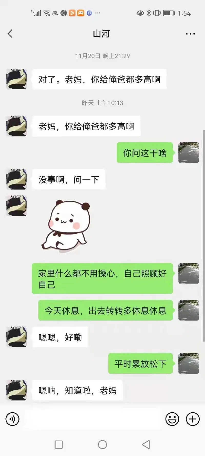 陳璽名曾和肖思遠在一起工作生活過一年。如今,他在武漢上軍校。每個周末,他都會雷打不動地和“肖媽媽”“肖爸爸”視頻聊天。劉利霞的微信上,保留著他們長長的聊天記錄,“老媽,你給(跟)俺爸多高啊”“你們二老要多注意保重身體,不要干太多重活……”