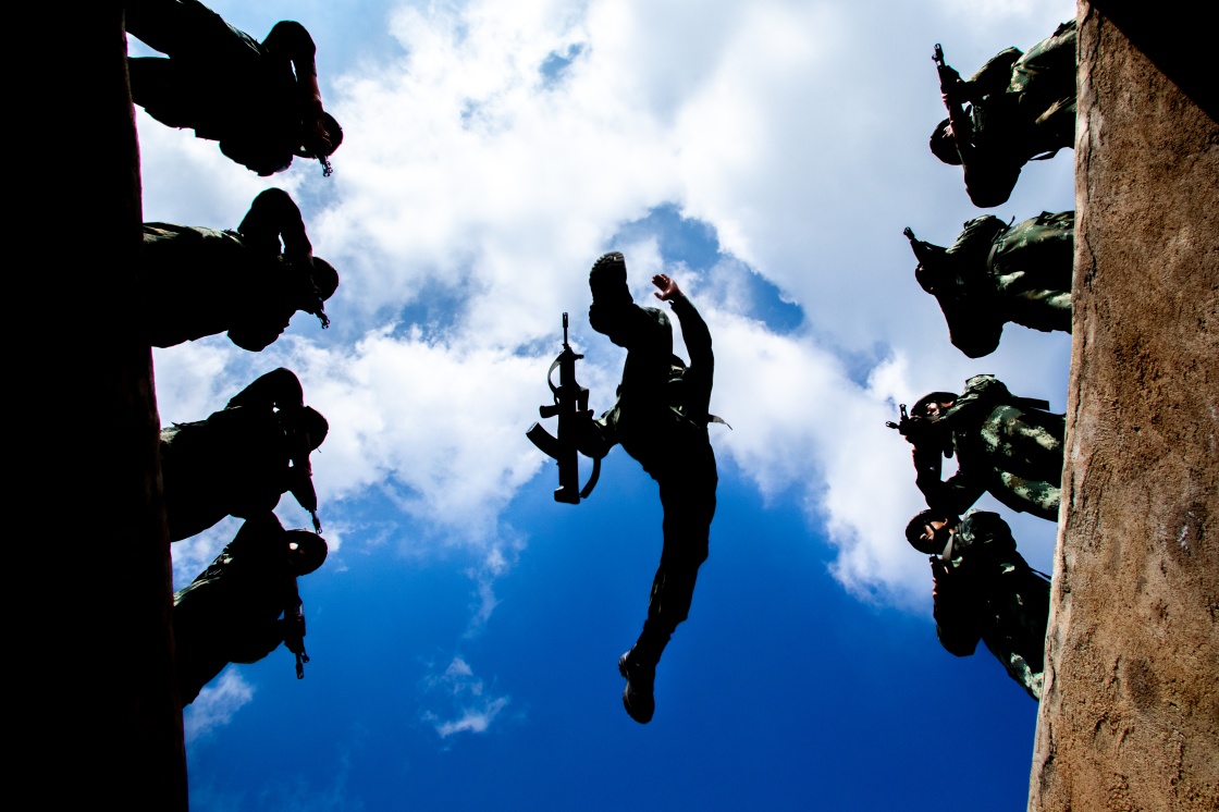 8月1日,武警廣西總隊(duì)玉林支隊(duì)某部不畏高溫練兵備戰(zhàn),特戰(zhàn)隊(duì)員攜槍通過(guò)壕溝。