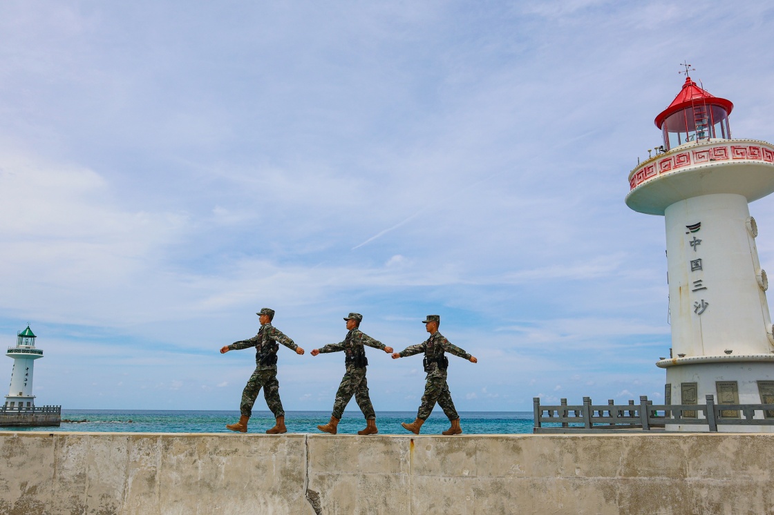 8月1日,武警海南總隊(duì)海口支隊(duì)機(jī)動(dòng)四中隊(duì)官兵在三沙永興島巡邏執(zhí)勤。