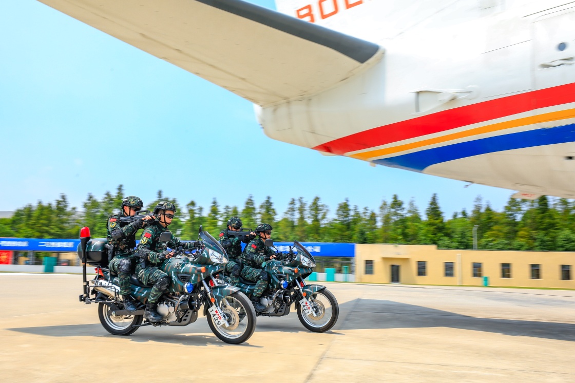 8月1日,武警上海總隊(duì)機(jī)動(dòng)第一支隊(duì)特戰(zhàn)某中隊(duì)組織交通工具反劫持綜合演練,特戰(zhàn)隊(duì)員乘坐摩托車(chē)接近“被劫持飛機(jī)”。