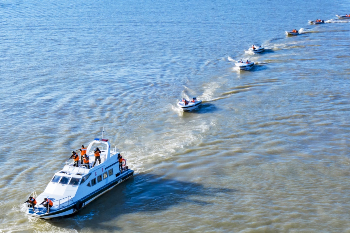 8月1日,武警湖南總隊(duì)岳陽(yáng)支隊(duì)組織官兵在洞庭湖某水域開(kāi)展水上反恐演練,官兵駕駛船艇呈單縱隊(duì)追擊目標(biāo)(無(wú)人機(jī)照片)。