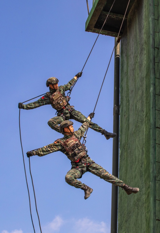 8月1日,武警廣西總隊(duì)賀州支隊(duì)組織特戰(zhàn)隊(duì)員進(jìn)行側(cè)身下滑訓(xùn)練。