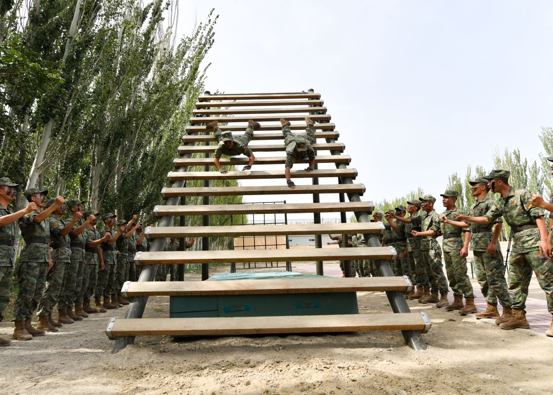 8月1日,火箭軍某部官兵在“獵人意志”訓(xùn)練中穿越斜梯。
