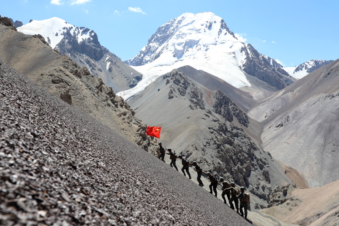 8月1日,新疆軍區(qū)庫(kù)爾干邊防連巡邏分隊(duì)官兵攀爬“刀背山”。