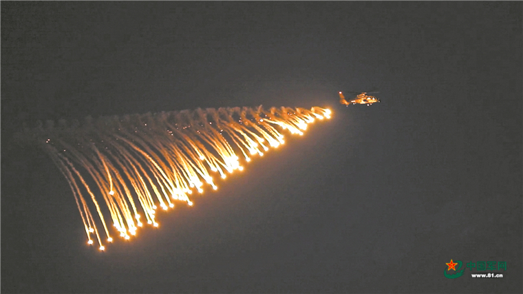 夜間訓(xùn)練中,戰(zhàn)機(jī)釋放紅外干擾彈。