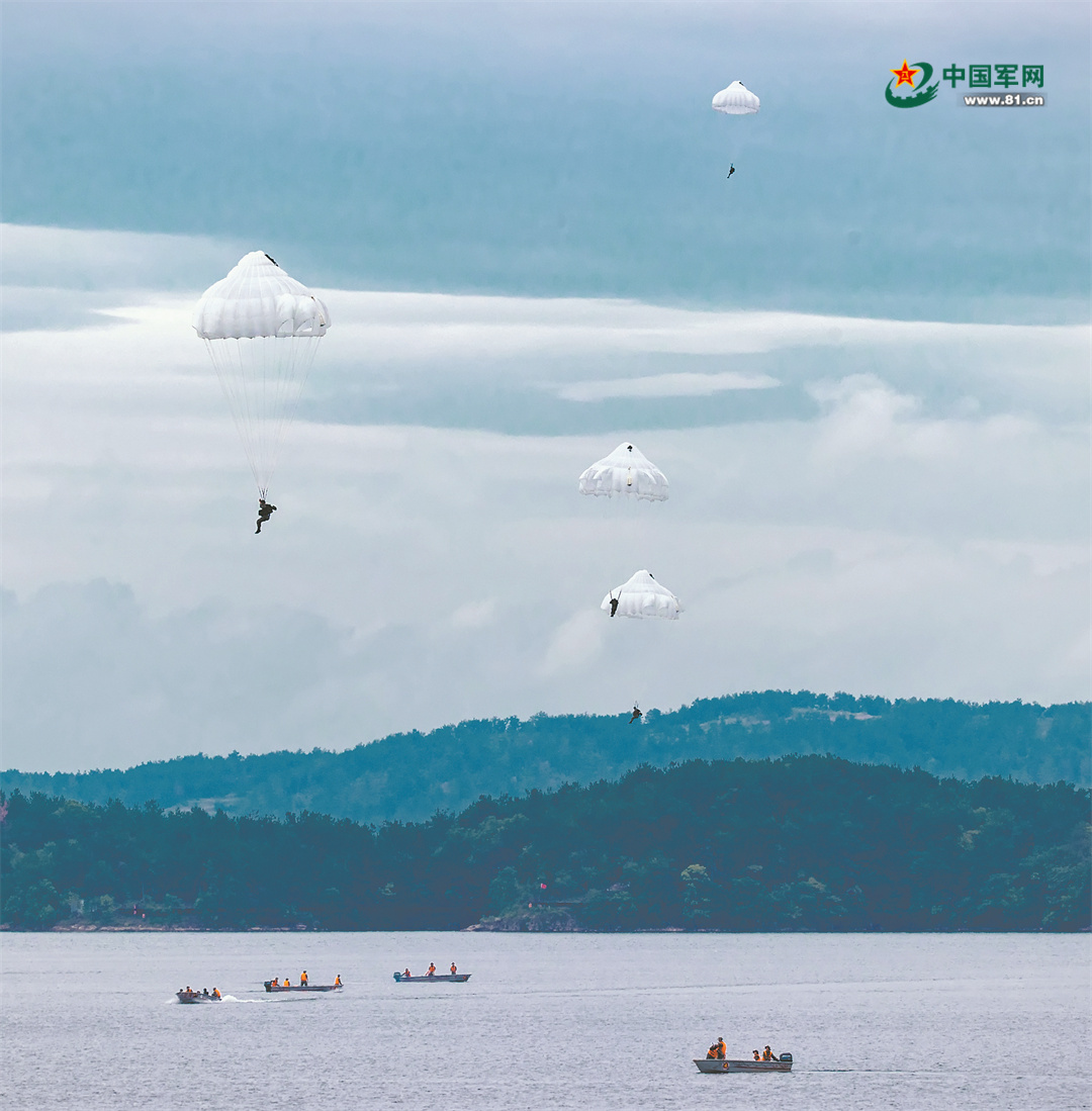 “跳!跳!……”離機(jī)指令下達(dá),隊(duì)員們迅速離機(jī)。很快,水天之間綻放出朵朵傘花。