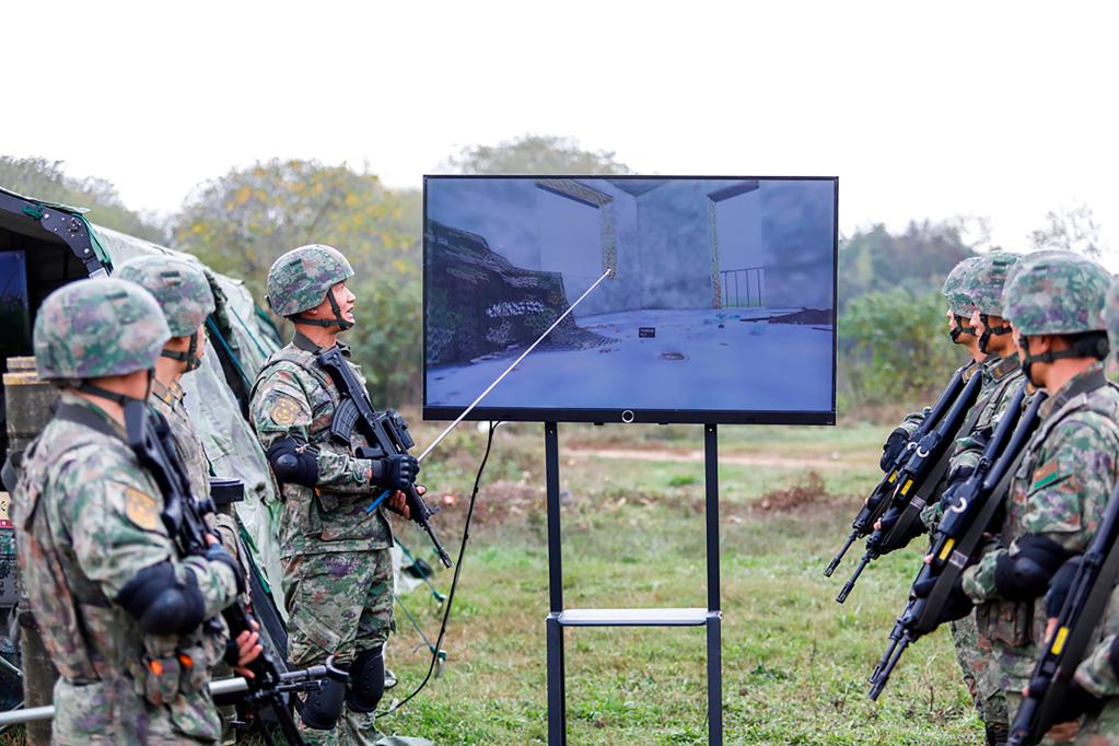 第71集團(tuán)軍“臨汾旅”官兵使用城市作戰(zhàn)仿真系統(tǒng)進(jìn)行訓(xùn)練(2022年11月19日攝)。新華社發(fā)(何丹 攝)