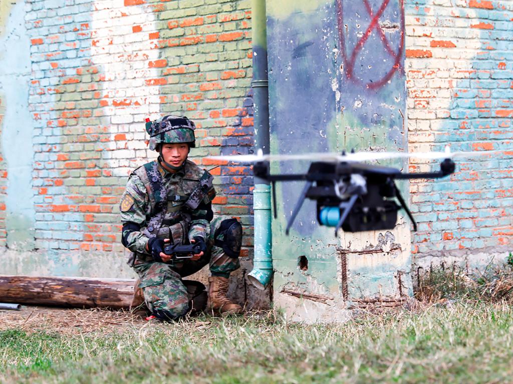 第71集團(tuán)軍“臨汾旅”組織城鎮(zhèn)攻防演練,無人機(jī)操作手使用無人機(jī)投擲煙霧彈(2022年11月21日攝)。新華社發(fā)(耿黎 攝)