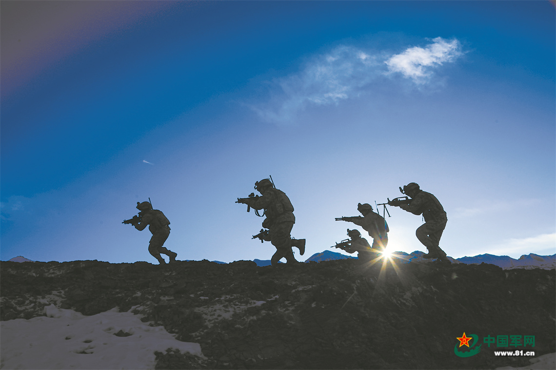 1月4日,新疆軍區(qū)某團(tuán)組織跨晝夜實(shí)戰(zhàn)化演練。圖為傍晚時(shí)分官兵向目標(biāo)發(fā)起沖擊。陳 明攝
