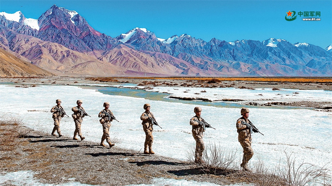 近日,新疆軍區(qū)某團(tuán)官兵執(zhí)行巡邏任務(wù)。雪山巍峨挺立,官兵瞪大眼睛,忠誠守護(hù)壯美山河。金延恩 攝
