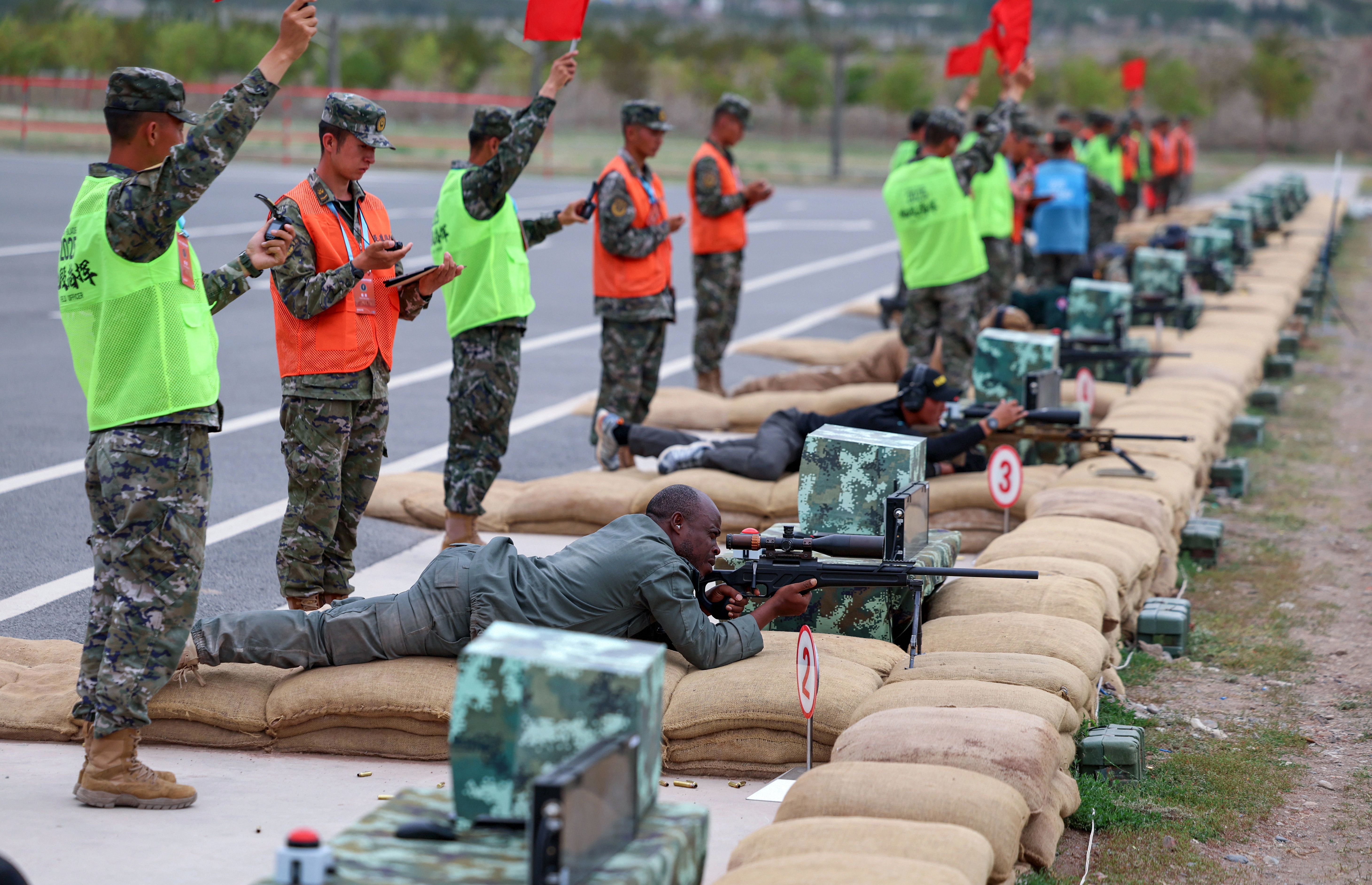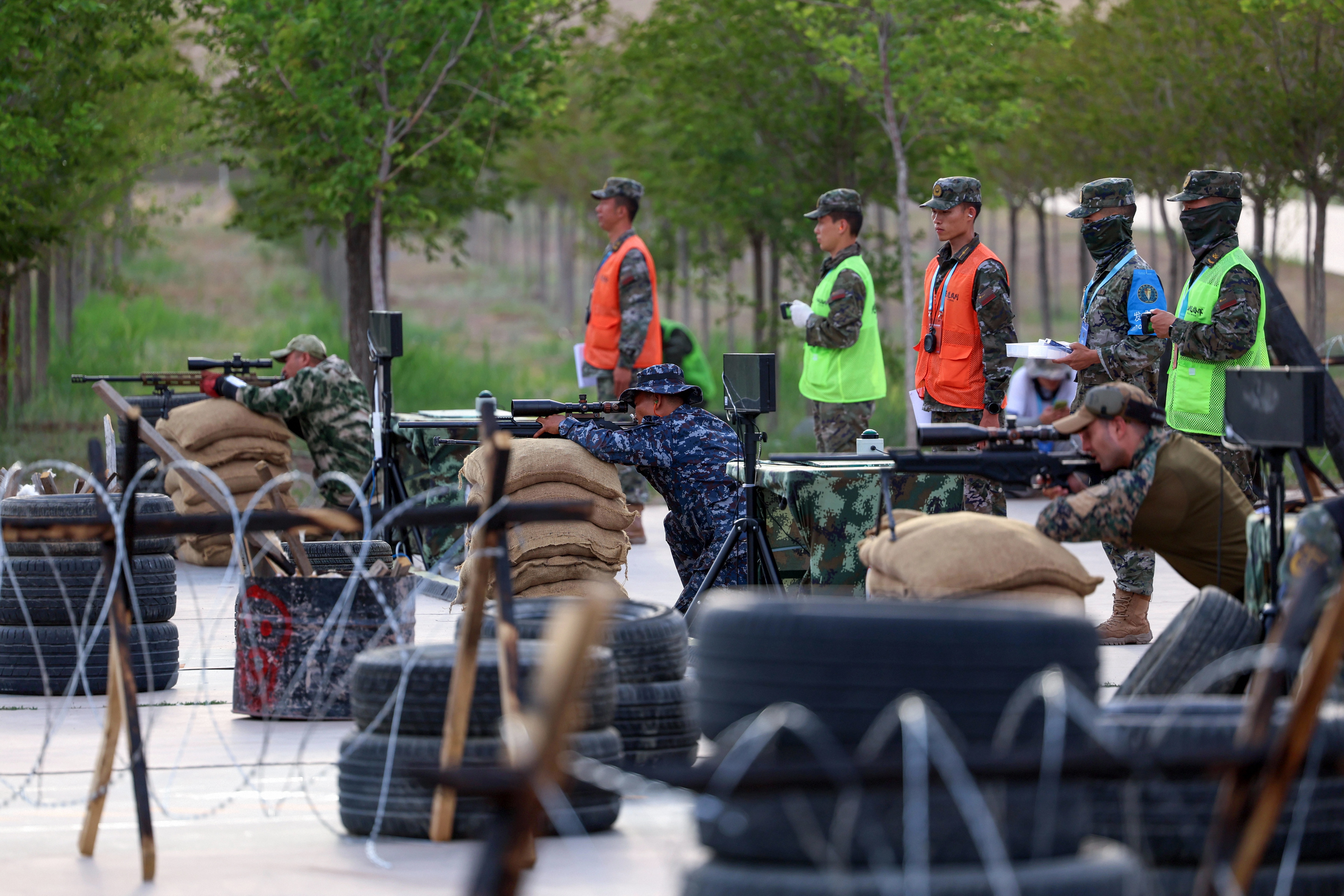 7月15日下午,在位于新疆烏魯木齊的武警部隊(duì)某訓(xùn)練基地,參加“鋒刃-2025”國(guó)際狙擊手射擊競(jìng)賽的各國(guó)參賽隊(duì)員展開激烈角逐。圖為各國(guó)參賽隊(duì)員進(jìn)行“筑壘御敵”課目競(jìng)賽。侯崇慧 攝