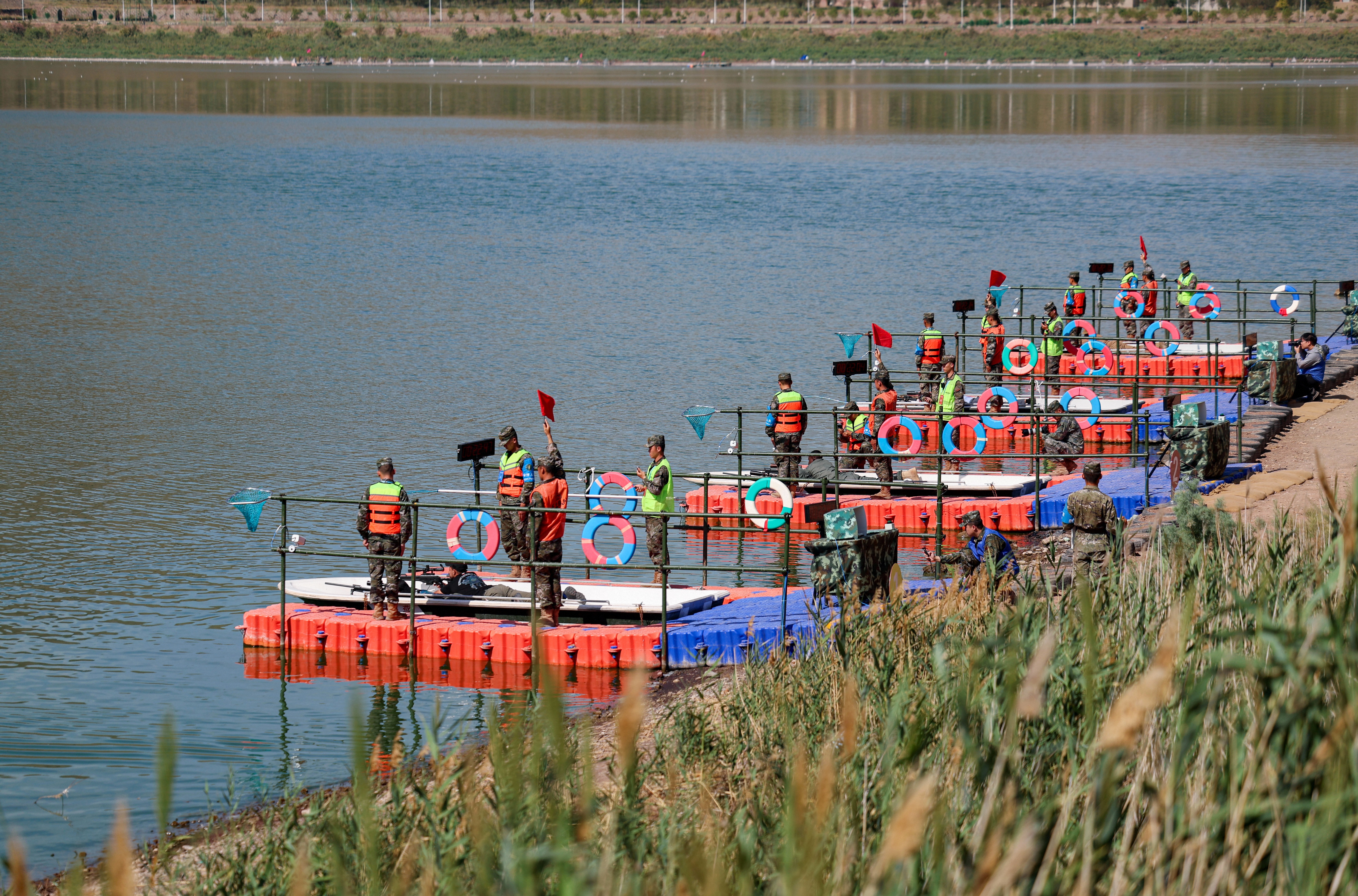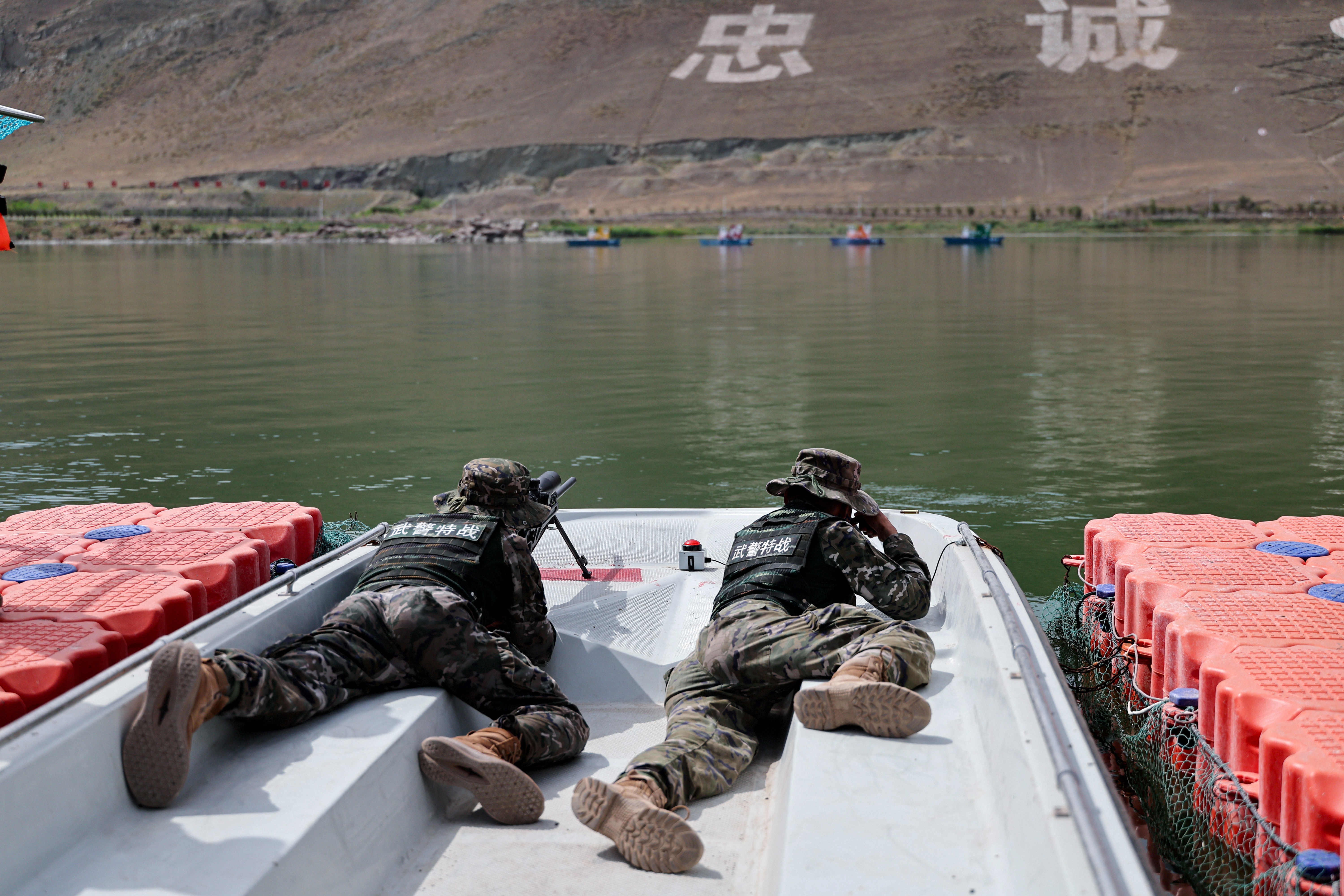 7月16日上午,在位于新疆烏魯木齊的武警部隊(duì)某訓(xùn)練基地,參加“鋒刃-2025”國(guó)際狙擊手射擊競(jìng)賽的各國(guó)參賽隊(duì)員展開激烈角逐。圖為各國(guó)參賽隊(duì)員進(jìn)行“搭乘舟艇水上狙擊”課目競(jìng)賽。侯崇慧 攝