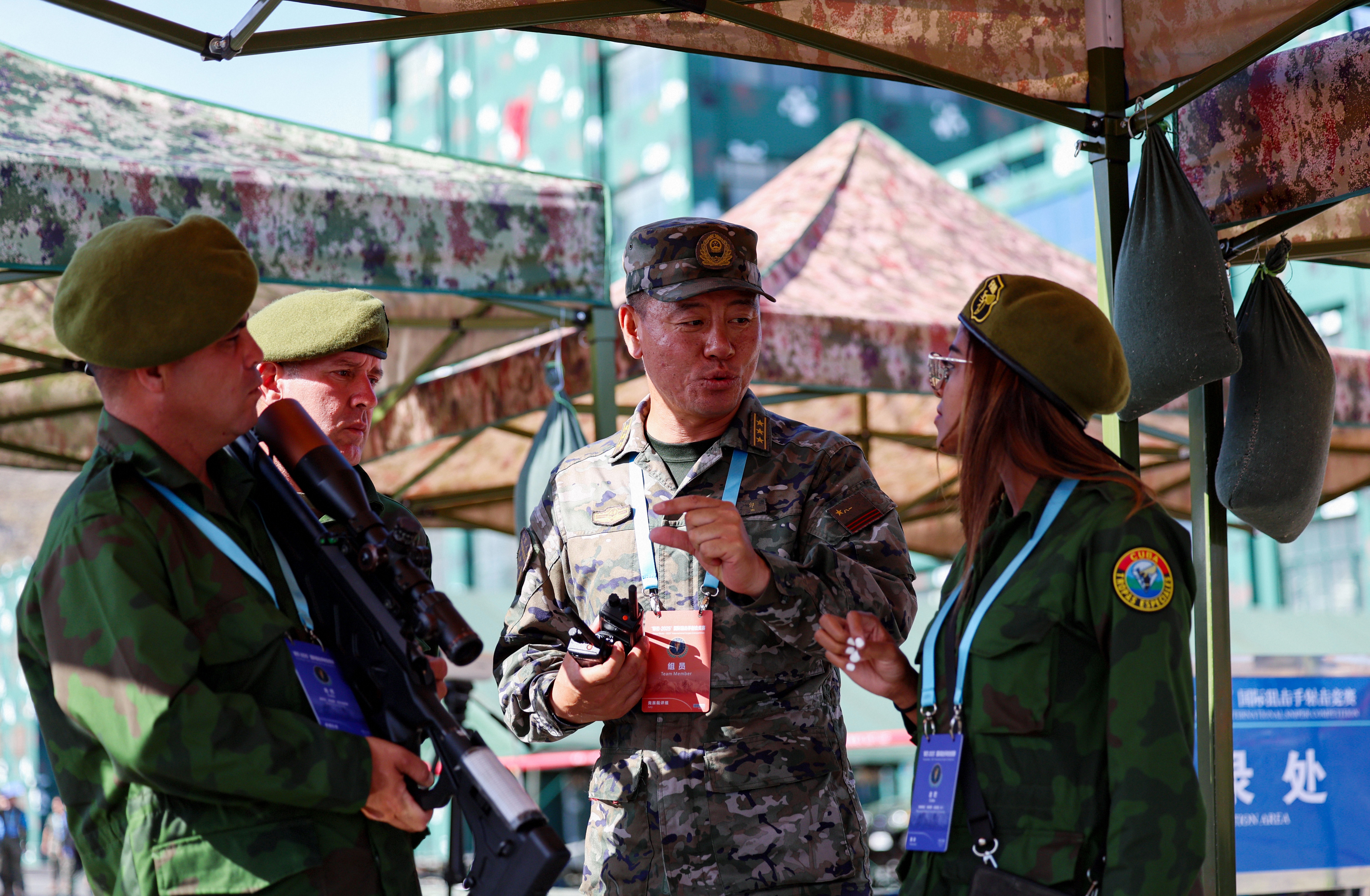 7月16日上午,在位于新疆烏魯木齊的武警部隊(duì)某訓(xùn)練基地,參加“鋒刃-2025”國(guó)際狙擊手射擊競(jìng)賽的各國(guó)參賽隊(duì)員展開激烈角逐。圖為工作人員與古巴參賽隊(duì)員交流射擊心得。侯崇慧 攝