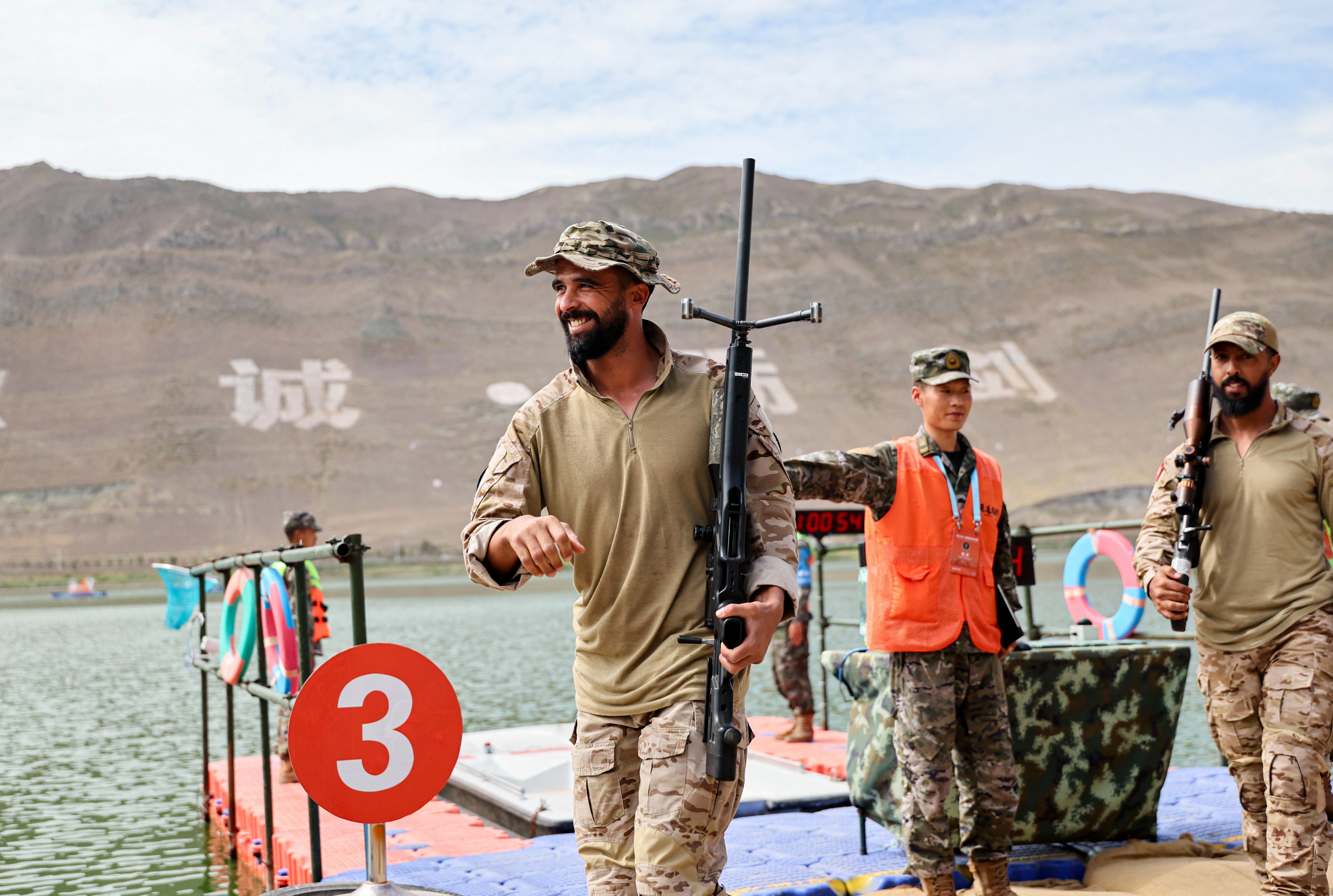 7月16日上午,在位于新疆烏魯木齊的武警部隊(duì)某訓(xùn)練基地,參加“鋒刃-2025”國(guó)際狙擊手射擊競(jìng)賽的各國(guó)參賽隊(duì)員展開激烈角逐。圖為突尼斯參賽隊(duì)員在“搭乘舟艇水上狙擊”課目競(jìng)賽中自信走下賽場(chǎng)。侯崇慧 攝
