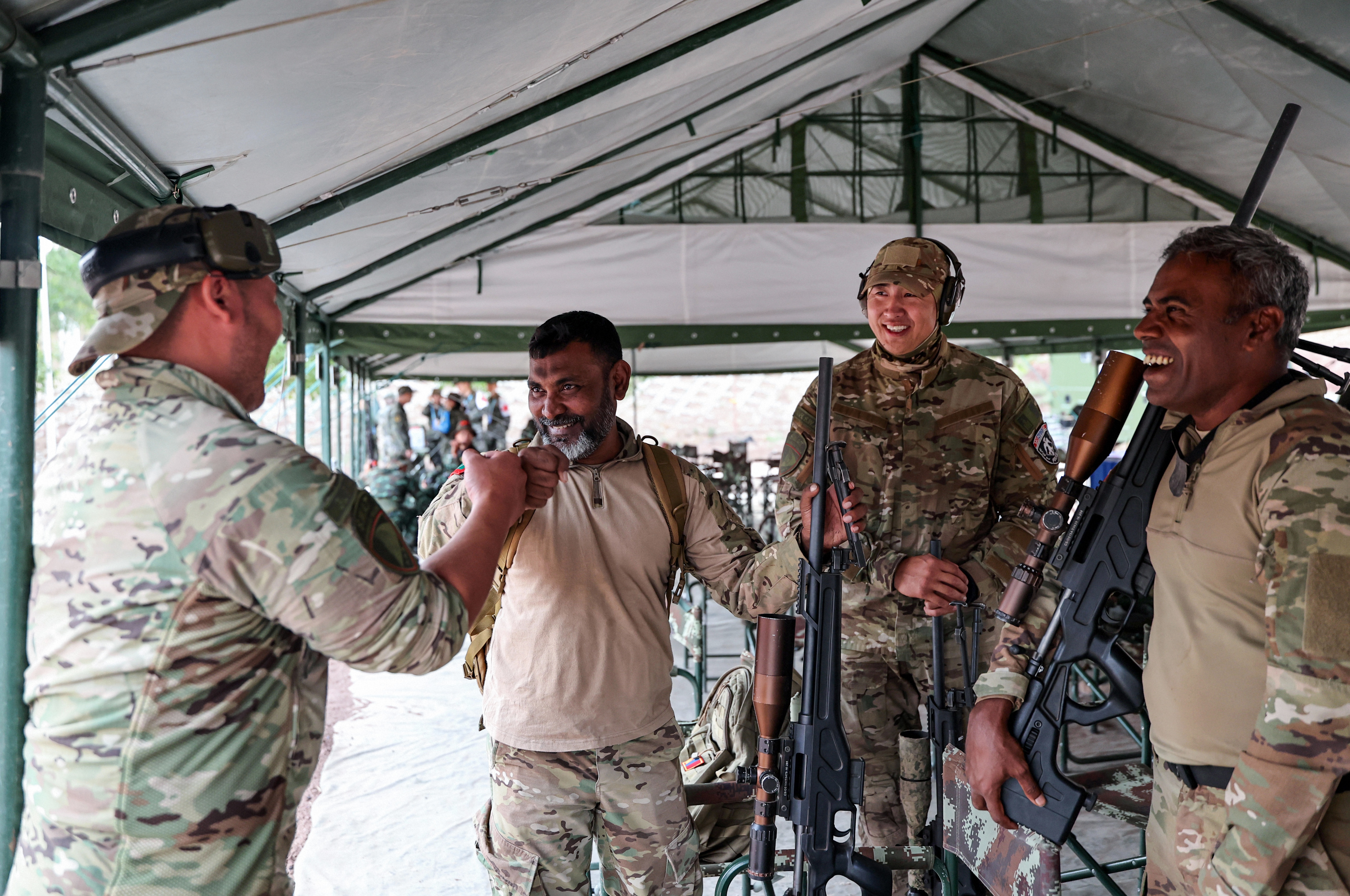 7月15日下午,在位于新疆烏魯木齊的武警部隊(duì)某訓(xùn)練基地,參加“鋒刃-2025”國(guó)際狙擊手射擊競(jìng)賽的各國(guó)參賽隊(duì)員展開激烈角逐。圖為參賽隊(duì)員相互加油鼓勁。侯崇慧 攝