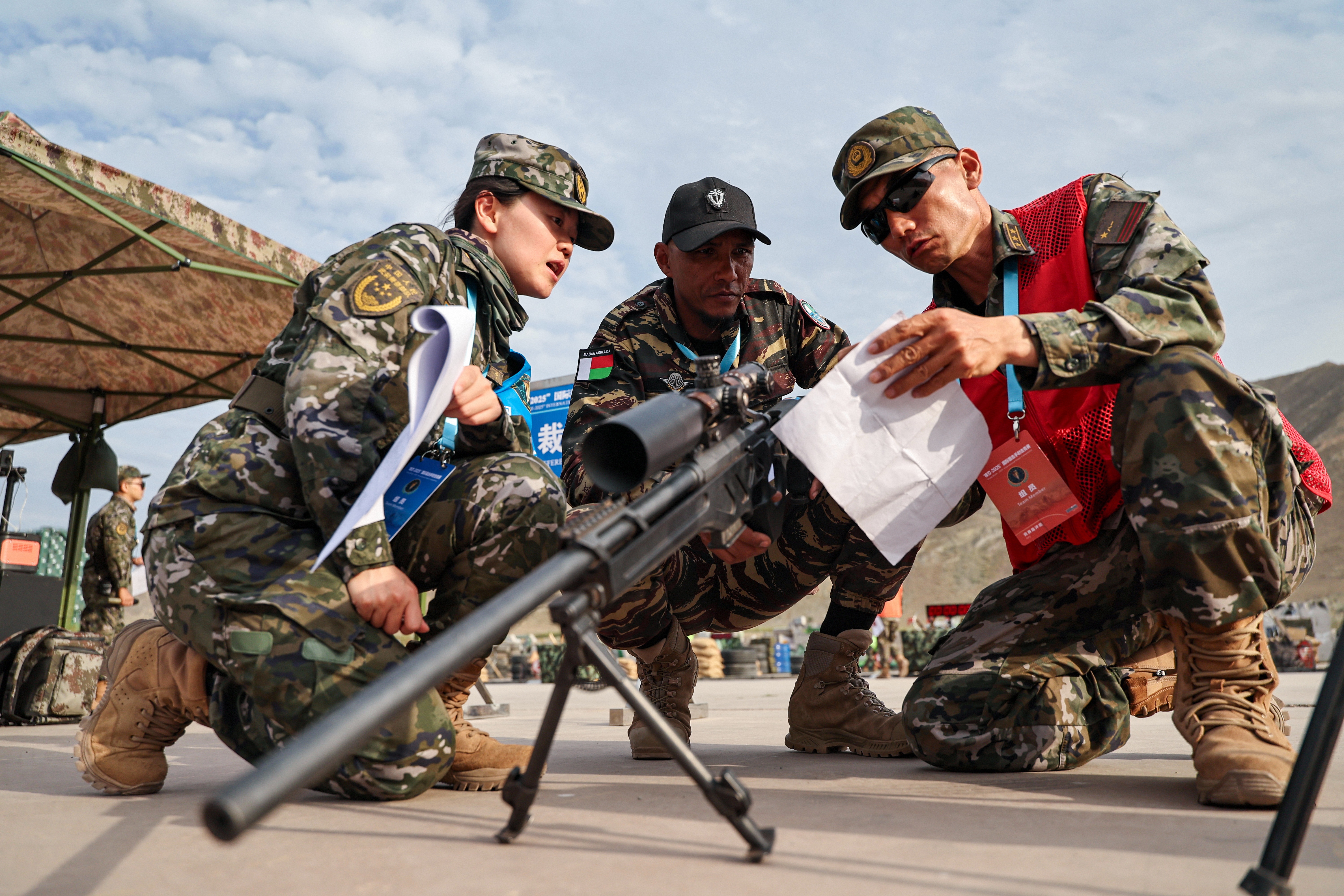 7月15日下午,在位于新疆烏魯木齊的武警部隊(duì)某訓(xùn)練基地,參加“鋒刃-2025”國(guó)際狙擊手射擊競(jìng)賽的各國(guó)參賽隊(duì)員展開激烈角逐。圖為工作人員向馬達(dá)加斯加參賽隊(duì)員介紹武器性能。侯崇慧 攝