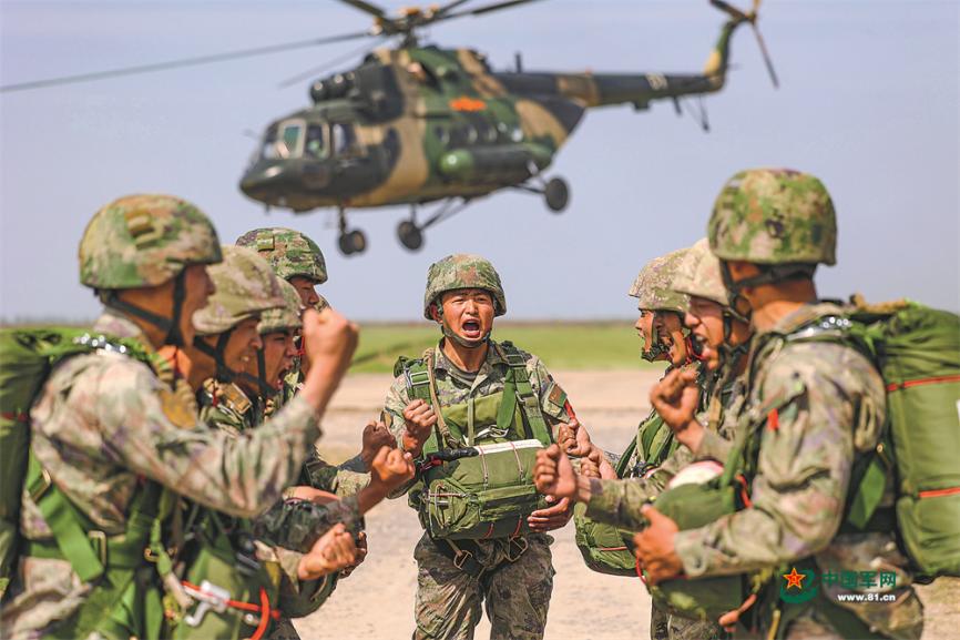 八連官兵傘降實跳訓練前互相鼓勁。胡雪峰攝