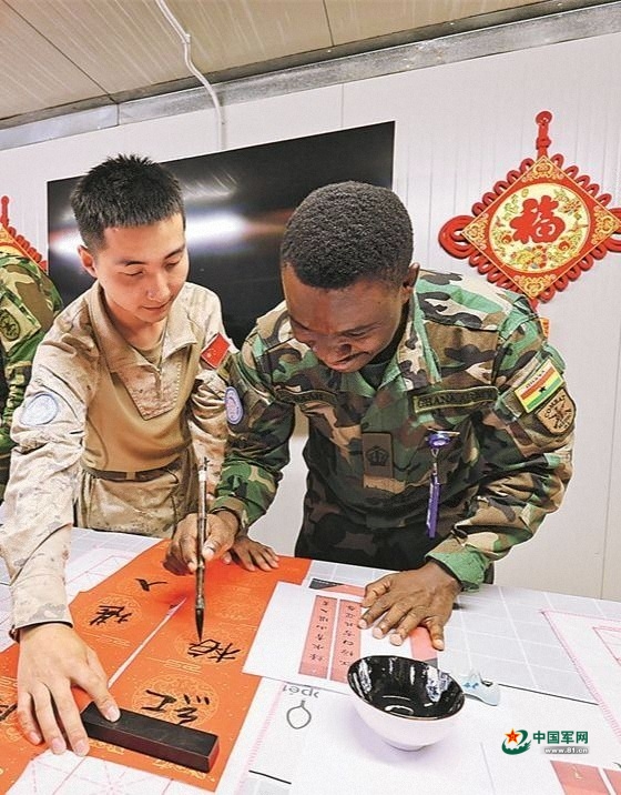新春佳節(jié)來臨之際,中國第二批赴阿卜耶伊維和快反分隊(duì)開展文化交流活動,邀請維和友軍一同書寫春聯(lián),感受中國傳統(tǒng)年俗魅力。韓瑞田 攝