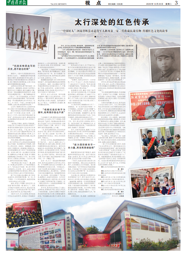 一家三代70余載的接力堅(jiān)守,收獲了社會(huì)各界的認(rèn)可。展覽館被命名為“河南省國(guó)防教育基地”,他們家庭獲得“全國(guó)文明家庭”“全國(guó)五好家庭”等榮譽(yù),耿風(fēng)泉也先后被評(píng)為“中國(guó)好人”“河南省勞動(dòng)模范”“國(guó)防教育先進(jìn)個(gè)人”等。看著滿墻榮譽(yù),耿風(fēng)泉常跟家人說:“這些榮譽(yù)不是終點(diǎn),而是一份更重的責(zé)任。抗戰(zhàn)實(shí)物承載著國(guó)家和民族的記憶,讓它們‘活’起來、傳下去,才對(duì)得起先烈們的犧牲與奉獻(xiàn)?!?/p>