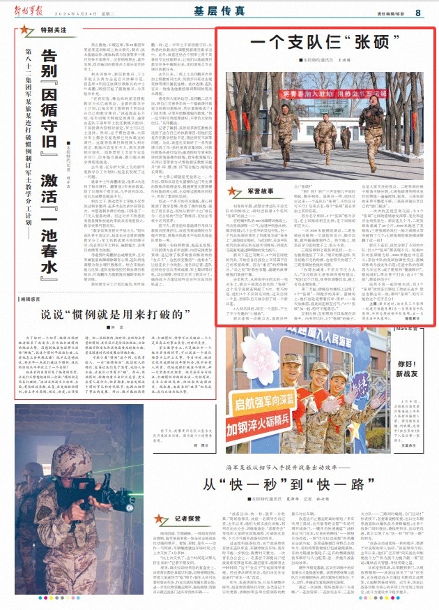 “到!到!到!”三聲答到幾乎同時(shí)響起,整齊響亮。值班員一愣,很快反應(yīng)過來:一個(gè)連隊(duì)仨“張碩”,不作區(qū)分可不行!后來點(diǎn)名,每個(gè)“張碩”前必須加上其所在班。