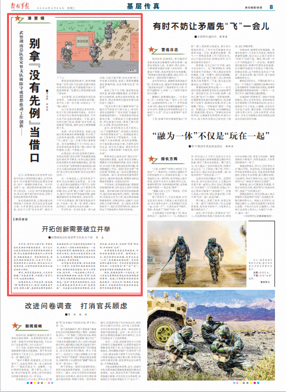 現(xiàn)在,我隨身攜帶一個筆記本,專門用來記錄那些沒有先例但值得推動的事項。我想,只有探索創(chuàng)新的嘗試越來越多,“沒有先例”的困擾才會越來越少,才能推動部隊建設(shè)在銳意進(jìn)取中實現(xiàn)高質(zhì)量發(fā)展。