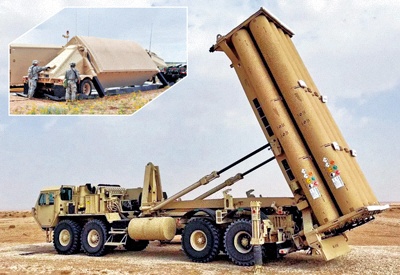美軍薩德系統(tǒng)發(fā)射車(大圖)及其雷達(dá)(小圖)。