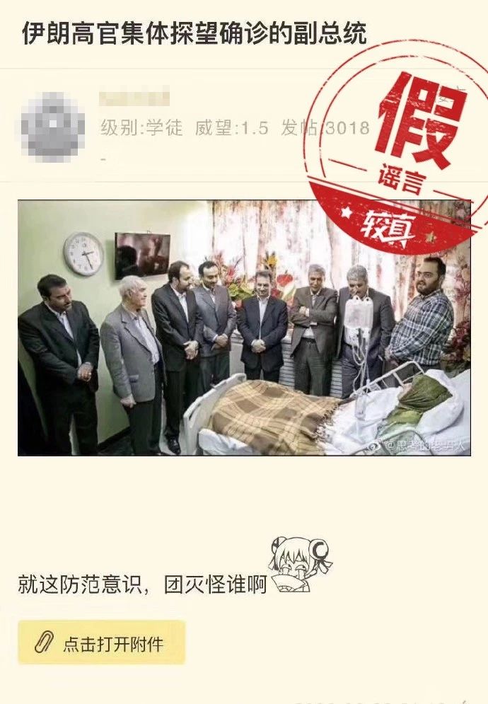 有網(wǎng)帖說(shuō),伊朗高官集體探望確診的副總統(tǒng),沒(méi)有一個(gè)人戴口罩。配文稱(chēng):就這防范意識(shí),團(tuán)滅怪誰(shuí)啊。