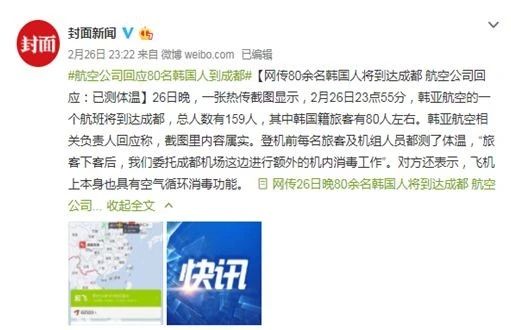 網(wǎng)傳乘坐2月26日晚航班到成都的韓籍人員只量體溫就放行,而沒(méi)有實(shí)行隔離。
