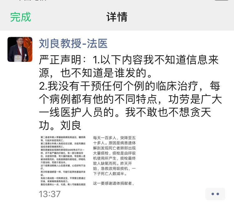 劉良教授已經(jīng)在個(gè)人社交賬號(hào)上辟謠:以下內(nèi)容我不知道信息來(lái)源,也不知道是誰(shuí)發(fā)的。我沒(méi)有干預(yù)任何個(gè)例的臨床治療,每個(gè)病例都有他的不同特點(diǎn),功勞是廣大一線醫(yī)護(hù)人員的。