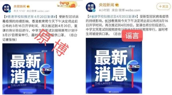 今日,一張“央視新聞”的微博截圖在家長(zhǎng)群、朋友圈傳播。截圖顯示“長(zhǎng)沙教育局今天下午決定將此前公布的3月16日開(kāi)學(xué)時(shí)間,再次推遲到4月20日,復(fù)課也將分階段進(jìn)行”。經(jīng)認(rèn)真比對(duì)發(fā)現(xiàn),此謠言所用的原圖是“香港學(xué)校擬推遲至4月20日復(fù)課”的微博消息。經(jīng)過(guò)PS,將“香港”替換成了“長(zhǎng)沙”。請(qǐng)廣大家長(zhǎng)朋友不要上當(dāng)受騙。
