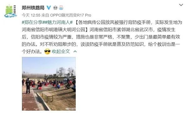 據(jù)鄭州鐵路局介紹,多地流傳的“公園放風(fēng)被強(qiáng)行背防疫手冊(cè)”,實(shí)際發(fā)生地為河南省信陽(yáng)市明港鎮(zhèn)大明河公園。河南省信陽(yáng)市緊鄰湖北省武漢市,疫情發(fā)生后,信陽(yáng)市疫情較為嚴(yán)重,措施也是非常嚴(yán)格,不聚集、少出門(mén)是最簡(jiǎn)單有效的辦法。