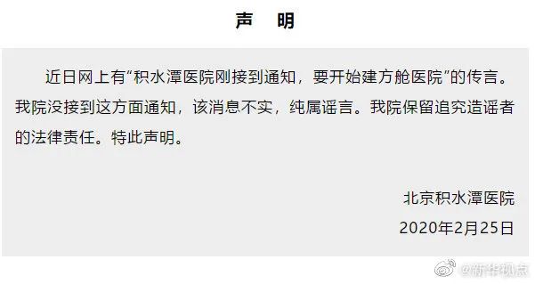 北京積水潭醫(yī)院于2月25日在官微發(fā)出聲明,表示“積水潭醫(yī)院剛接到通知,要開(kāi)始建方艙醫(yī)院”是謠言。