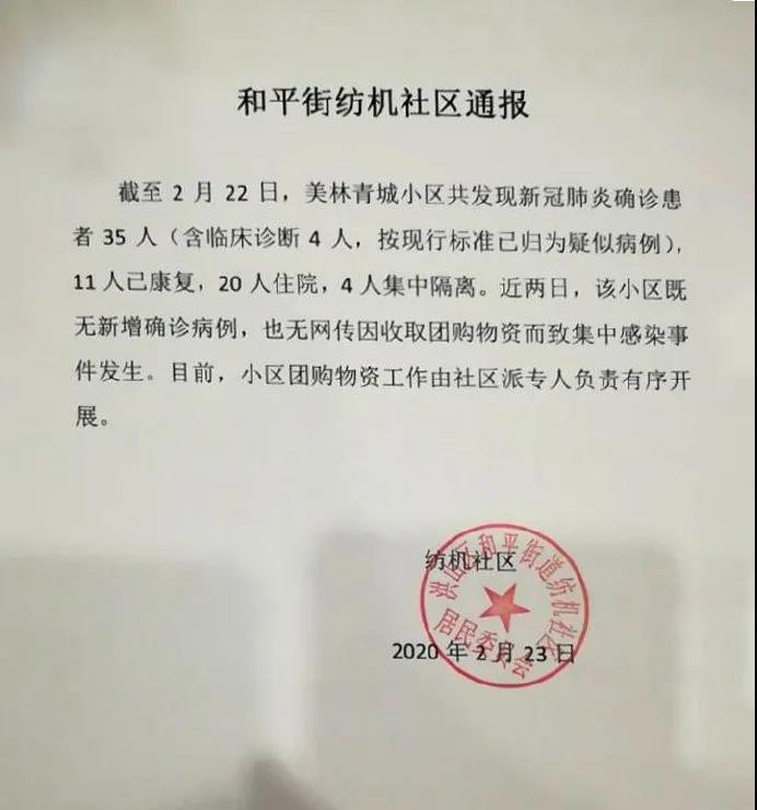 23日,據(jù)湖北省武漢市@洪山發(fā)布 辟謠:經(jīng)@紡機(jī)社區(qū) 核實(shí),截至22日,該小區(qū)共有新冠肺炎確診患者35人(含臨床診斷4人),11人已康復(fù),20人住院,4人集中隔離。近兩日,該小區(qū)既無(wú)新增確診病例,也無(wú)因收取物資致集中感染事件發(fā)生。目前,小區(qū)團(tuán)購(gòu)物資工作由社區(qū)派專(zhuān)人負(fù)責(zé)正常開(kāi)展。