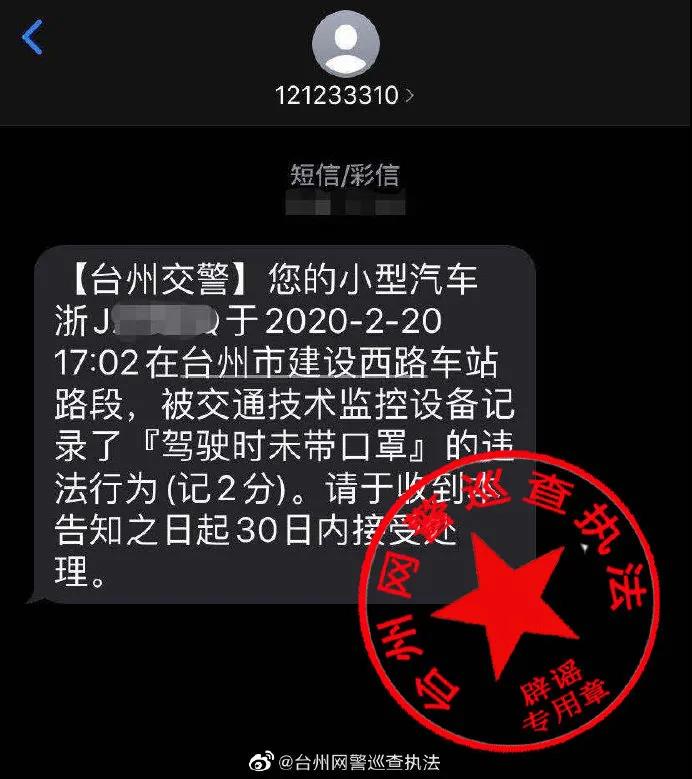 近日,臺(tái)州本地朋友圈在流傳一張“駕駛時(shí)未帶口罩的交通違法告知短信”截圖,本地網(wǎng)民在微信群紛紛熱傳并提醒他人要帶好口罩。經(jīng)交警部門(mén)核實(shí),該信息為謠言。