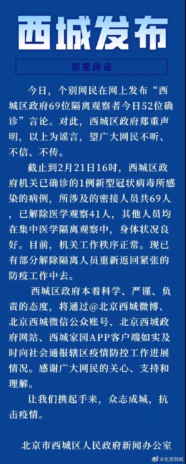 微博“西城發(fā)布”辟謠稱(chēng):西城區(qū)政府69位隔離觀察者今日52位確診系謠言。望廣大網(wǎng)民不聽(tīng)、不信、不傳,讓我們攜起手來(lái),眾志成城,抗擊疫情。