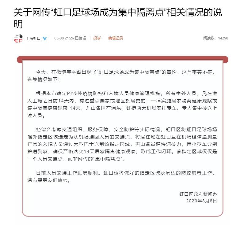 3月8日,微博、微信群中出現(xiàn)多個(gè)傳言稱,“上海虹口足球場(chǎng)被作為重點(diǎn)國(guó)家回滬人員集中隔離點(diǎn)”,亦有傳言稱是“上海重點(diǎn)國(guó)家回滬人員集散地”。