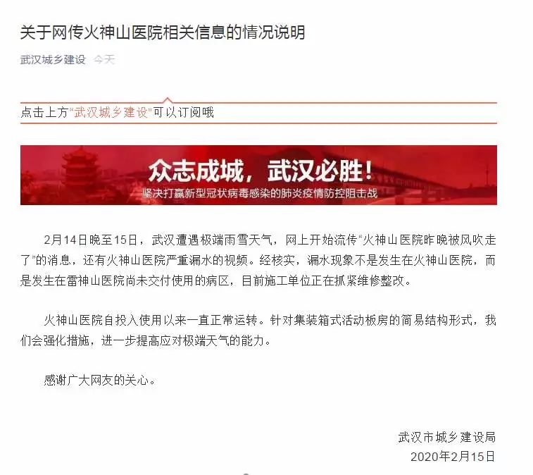 2月14日晚,武漢遭遇極端雨雪天氣并伴隨大風(fēng)。15日,網(wǎng)上開始流出“火神山醫(yī)院被大風(fēng)吹走了”“病人在分流”,另有一段疑似是火神山醫(yī)院出現(xiàn)較為嚴重的漏水現(xiàn)象的視頻在網(wǎng)上流傳。