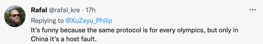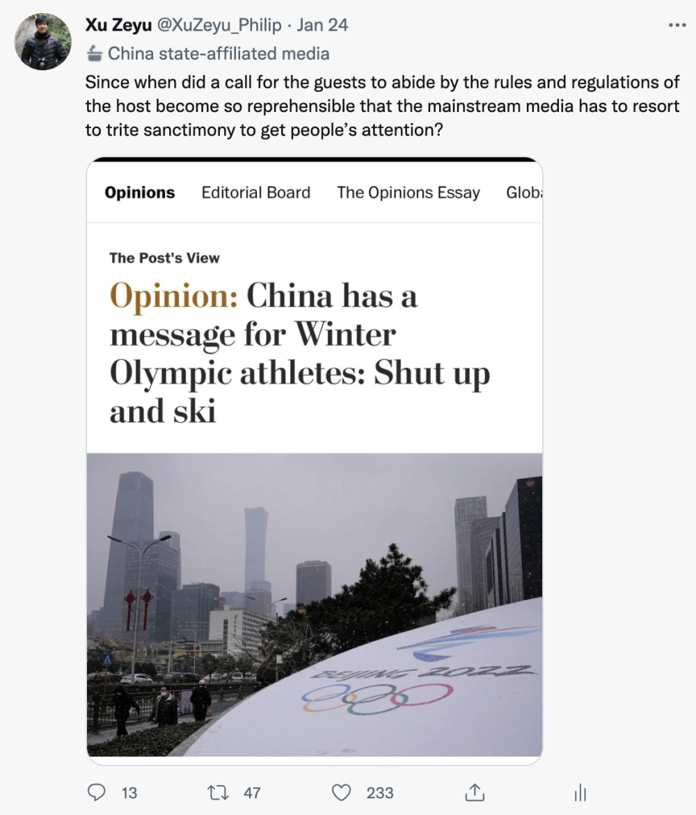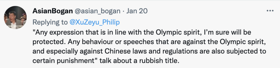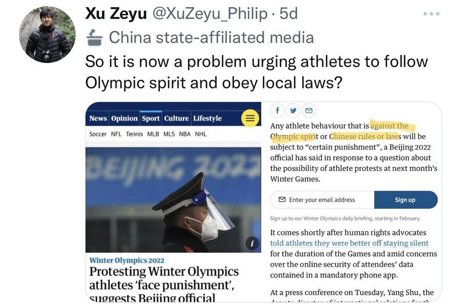 為此,新華社記者徐澤宇在推特上質(zhì)問這篇報道:“難道提醒運(yùn)動員堅持奧林匹克精神和遵守當(dāng)?shù)胤煞ㄒ?guī)也有錯嗎?”