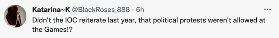 一名海外網(wǎng)友在留言中呼應(yīng)了《奧林匹克憲章》的規(guī)定:“國際奧委會不是在去年重申過賽會上不允許政治示威嗎?”