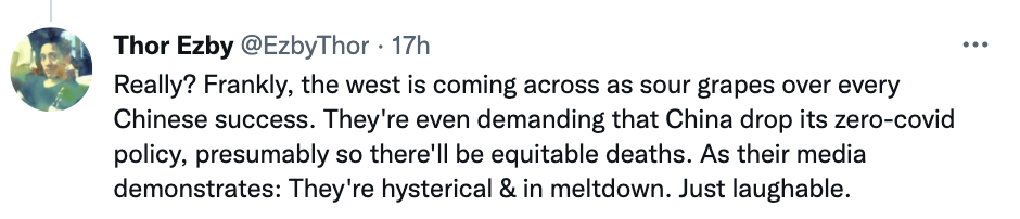 更有網(wǎng)友一針見血:“說實話,西方嫉妒中國取得的每一個成功。他們甚至要求中國取消‘清零’政策,其險惡用心昭然若揭。正如他們的媒體所表現(xiàn)出的歇斯底里一樣,西方目前的狀況是可笑至極的?!?/p>