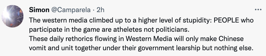 一名叫作Simon的網(wǎng)友指出外媒的這種不實報道只會起到適得其反的效果:“西方媒體的愚蠢再次登峰造極,別忘了,參加冬奧會的人是運(yùn)動員而不是政客。這些言論只會使中國人在政府的領(lǐng)導(dǎo)下更加團(tuán)結(jié)?!?/p>