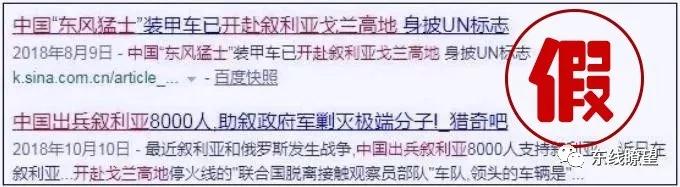 事件:“震驚!中國出兵敘利亞!東風(fēng)猛士開赴戈蘭高地!”“敘利亞給予中國5000人出兵名額”“原隸屬蘭州軍區(qū)‘暗夜之虎’特種部隊(duì)抵達(dá)敘利亞拉塔基亞港口,抵達(dá)敘利亞的還包括原沈陽軍區(qū)特種部隊(duì)‘西伯利亞虎’”“敘利亞《祖國報(bào)》發(fā)表報(bào)道稱,根據(jù)中國駐敘利亞大使齊前進(jìn)表態(tài),中國軍隊(duì)擬以某種形式參與敘政府軍對(duì)伊德利卜戰(zhàn)役”……自2011年3月敘利亞內(nèi)戰(zhàn)爆發(fā)以來,類似的“震驚”消息在一些涉軍新媒體上翻新出現(xiàn),每每引起驚呼一片。