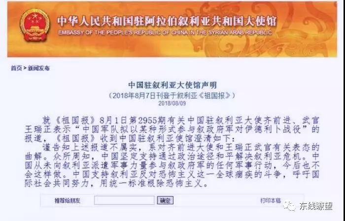 真相:2018年8月7日,中國駐敘利亞大使館發(fā)表聲明正式否認(rèn)了相關(guān)報(bào)道。聲明中指出,《祖國報(bào)》相關(guān)報(bào)道是對(duì)齊前進(jìn)大使和王瑞正武官有關(guān)表態(tài)的曲解。眾所周知,中國堅(jiān)定支持通過政治途徑和平解決敘利亞危機(jī)。中國從未向敘利亞派遣軍事力量參與敘政府軍的任何軍事行動(dòng),今后也不會(huì)這樣做。中國支持?jǐn)⒗麃喎磳?duì)恐怖主義這一全球痼疾的斗爭(zhēng),呼吁國際社會(huì)共同努力,用統(tǒng)一標(biāo)準(zhǔn)根除恐怖主義。事實(shí)上,中國政府?dāng)⒗麃唵栴}特使曾表示“軍事手段已被證明解決不了問題,只能制造更多殺戮和仇恨,對(duì)解決敘利亞危機(jī)沒有任何幫助”。