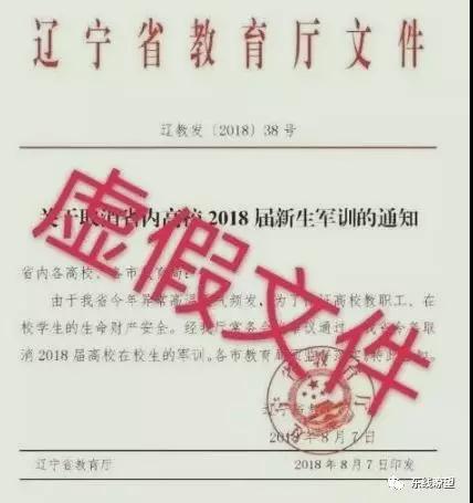 事件:今年8月,網(wǎng)絡(luò)上出現(xiàn)了一條“遼寧省取消2018屆新生軍訓(xùn)”的消息,相關(guān)頁面內(nèi)附有名為《關(guān)于取消省內(nèi)高校2018屆新生軍訓(xùn)的通知》文件,堂而皇之頂著遼寧省教育廳的大名,甚至蓋有所謂公章。文件中聲稱,“由于高溫天氣頻發(fā),為保護(hù)高校教職工、在校學(xué)生生命財(cái)產(chǎn)安全,取消2018屆高校在校生的軍訓(xùn)”。一直以來,由于軍訓(xùn)活動(dòng)直接與軍人形象相關(guān),社會(huì)關(guān)注度較高,向來是涉軍炒作熱點(diǎn)。類似“學(xué)生在軍訓(xùn)中屢屢被虐被打”“部隊(duì)教官素質(zhì)低下簡(jiǎn)單粗暴”“某大學(xué)軍訓(xùn)兩周3500人病倒”一類的造謠炒作幾乎每年都會(huì)出現(xiàn)。